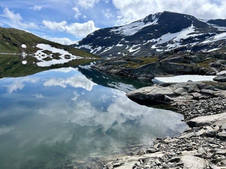Im Schatten der Riesen von Jotunheimen verbirgt sich ein Tal mit Blick auf das ewige Eis von Breheim.